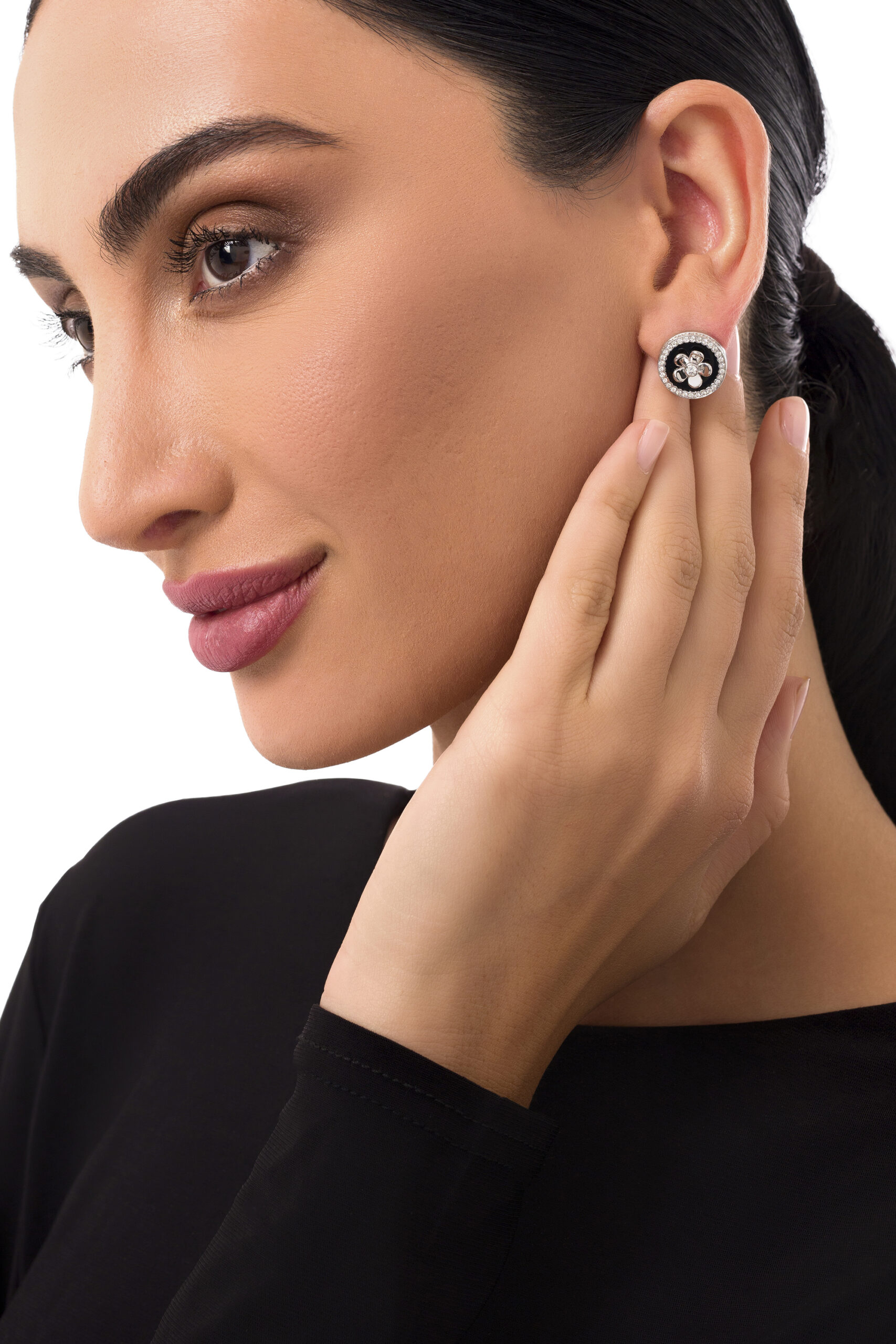 DIAMOND BLACK ONYX FLOWER ROUND EARRING W/G